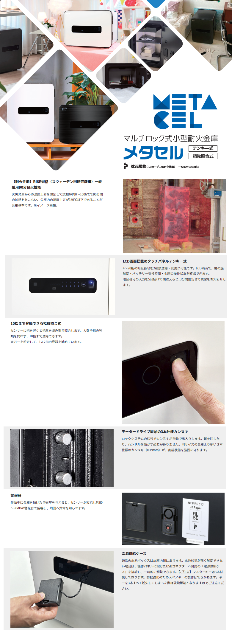 【モータードライブ搭載でラクラク開閉】 モータードライブ方式の採用により、カンヌキを自動で引き込みます。 扉の開扉時に、鍵を回したり、ハンドルを回す手間がありません。 【LCD画面搭載のタッチパネルテンキー式】 4~20桁の暗証番号を2種類登録・変更が可能です。LCD画面で、鍵の施解錠・ バッテリー交換時期・金庫の操作状況を確認できます。 暗証番号の入力を5回続けて間違えると、3分間警告音で異常をお知らせします。 【10指まで登録できる指紋照合式】 センサーに指を置くと指紋を読み取り照合します。 人数や指の種類を問わず、10 指まで登録できます。 ※万一を想定して、1人2指の登録を勧めています。 【閉め忘れ防止お知らせ機能】 扉を開けてから1分後に、『ピピ…ピピ…』と扉が空いていることを警告音で お知らせします。 【イタズラ防止機能】 タッチパネルに触れても操作できないようにロックできます。 【強固に守るカンヌキと警報機 - 防盗性能】 同サイズの金庫より多い3本仕様のカンヌキ(Φ19mm)が、施錠状態を 強固に守ります。 警報機は、作動中に金庫を傾けたり衝撃を与えると、 センサーが反応し約80~90dBの警報音で威嚇し、周囲へ異常を知らせます。 【電池残量がない場合は外部から電源供給】 通常の電池ボックスは扉庫内側にあります。 電池残量が無く解錠できない場合は、操作パネルに設けたUSBコネクターへ付属の 「電源供給ケース」を接続し、一時的に解錠できます。 【万一の火災から収納物を守る - 耐火性能】 火災発生からの温度上昇を想定して試験炉内0~1006℃で90分間の 加熱をおこない、金庫内の温度上昇が150℃以下であることが合格基準です。 【PRISE規格(スウェーデン国研究機構)】 一般紙用90分耐火 NT FIRE 017-90 Paper ※宝石や貴金属、アクセサリーなど高価な物、現金などは一時的な保管として ご利用ください。 長期不在等の場合には、侵入窃盗犯による金庫破りに合う恐れがあります。 |