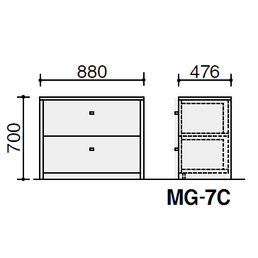 外寸法/W880×D476×H700 上下段共単ロック機能付き 収容寸法/(上下共) W772×D325×H260 |