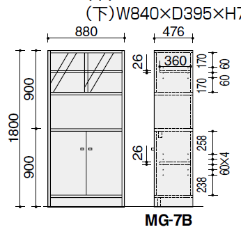 外寸法/W880×D476×H1800 収容寸法/(上)W840×D402×H460 (中)W840×D430×H400 (下)W840×D395×H735 |