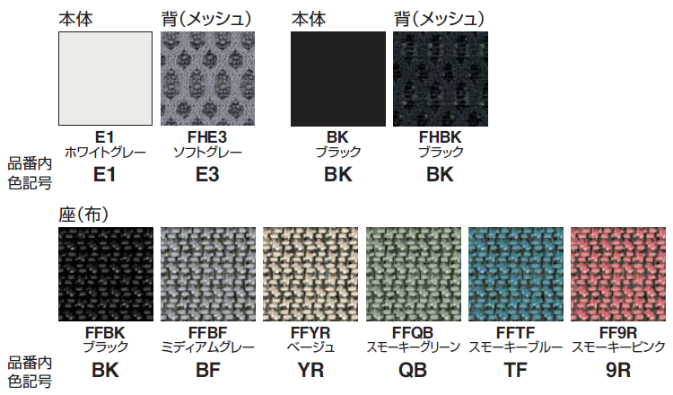 本体/背(メッシュ): E1 ホワイトグレー/E3 ソフトグレー BK ブラック/BK ブラック 座(布): BK ブラック BF ミディアムグレー YR ベージュ QB スモーキーグリーン TF スモーキーブルー 9R スモーキーピンク |