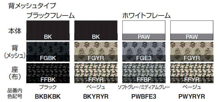背(メッシュ)/座(布): ●ブラックフレーム BKBKBK ブラック BKYRYR ベージュ ●ホワイトフレーム PWBFE3 ソフトグレー/ミディアムグレー PWYRYR ベージュ |
