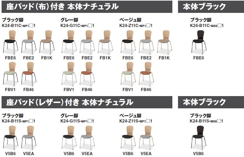 <本体(MP1 ナチュラル)> 座パッド(布): FBE6 ブラック FBE2 ライトグレー FB1K ソフトベージュ FBV1 ピーグリーン FB46 パティナブラウン 座パッド(PVCレザー): V5B6 ブラック V5EA ニュートラルグレー 脚: B ブラック(E6A) G E2A(ライトグレー) Z ソフトベージュ(1KA) <本体(MS9 ブラック)> 座パッド(布):FBE6 ブラック 座パッド(PVCレザー):V5B6 ブラック 脚:B ブラック(E6A) |