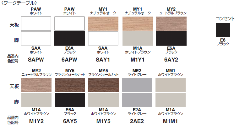 天板/脚: SAPW ホワイト(PAW)/ホワイト(SAA) 6APW ホワイト(PAW)/ブラック(E6A) SAY1 ナチュラルオーク(MY1)/ホワイト(SAA) M1Y1 ナチュラルオーク(MY1)/ホワイトブラウン(M1A) 6AY2 ニュートラルブラウン(MY2)/ブラック(E6A) M1Y2 ニュートラルブラウン(MY2)/ホワイトブラウン(M1A) 6AY5 ブラウンウォールナット(MY5)/ブラック(E6A) M1Y5 ブラウンウォールナット(MY5)/ホワイトブラウン(M1A) 2AE2 ライトグレー(ME2)/ライトグレー(E2A) M1M1 ホワイトブラウン(MM1)/ホワイトブラウン(M1A) コンセント:ブラック(E6) |
