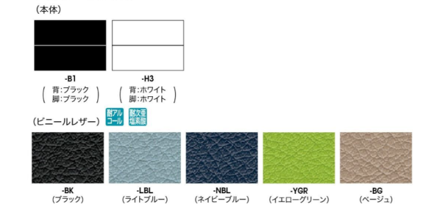 本体カラー: B1 ブラック H3 ホワイト 張地カラー(ビニールレザー): BK ブラック LBL ライトブルー NBL ネイビーブルー YGR イエローグリーン BG ベージュ |