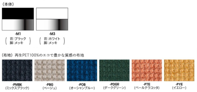 本体カラー: M1 ブラック M3 ホワイト 張地カラー(布張り): PMBK ミックスブラック PBG ベージュ POB オーシャンブルー PDGR ダークグリーン PTE ペールテラコッタ PYE イエロー |