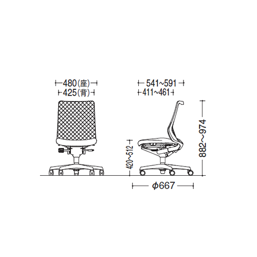 | 外寸 | 480W×541~591D×420~512SH・882~974H | 脚外径 | φ667 |