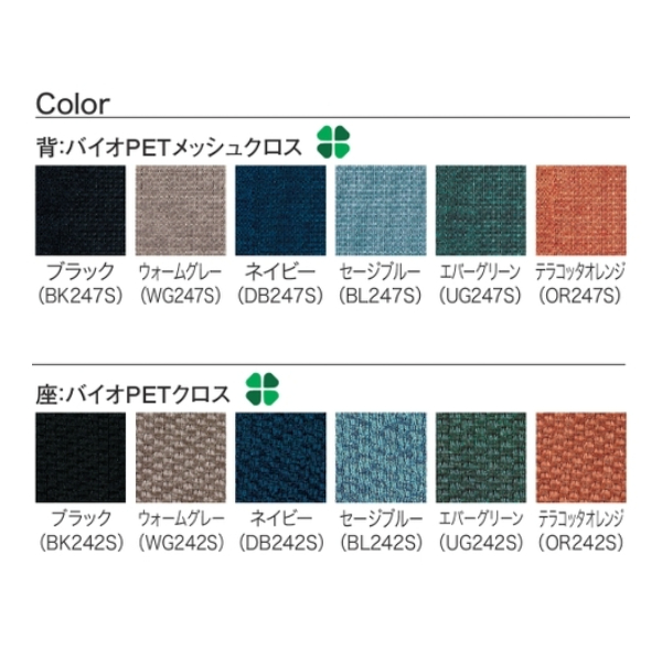背:バイオPETメッシュクロス/座:バイオPETクロス ブラック(BK247S)/ブラック(BK242S) ウォームグレー(WG247S)/ウォームグレー(WG242S) ネイビー(DB247S)/ネイビー(DB242S) セージブルー(BL247S)/セージブルー(BL242S) エバーグリーン(UG247S)/エバーグリーン(UG242S) テラコッタオレンジ(OR247S)/テラコッタオレンジ(OR242S) |