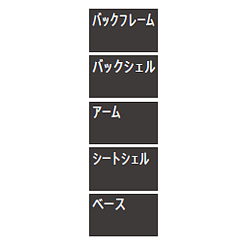 背座部:布張り,モードウレタン 背裏部:布張り,樹脂 肘部:本体支柱/樹脂,パッド部/ソフトパッド 脚部:強化プラスチック(PA) キャスター部:ナイロンキャスター |