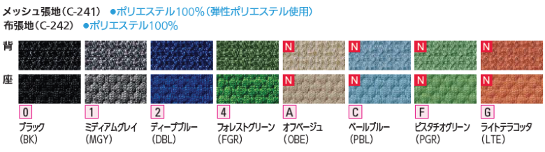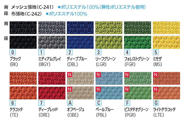 ■フレーム/脚 ホワイトフレーム/ホワイト脚 ホワイトフレーム/ブラック脚 ブラックフレーム/ブラック脚 ライトグレイフレーム/ライトグレイ脚 ライトグレイフレーム/ブラック脚 ■布張地 0 ブラック 1 ミディアムグレイ 2 ディープブルー 3 リーフグリーン ※ライトグレイフレーム不可 4 フォレストグリーン 5 ミモザ ※ライトグレイフレーム不可 6 テラコッタ ※ライトグレイフレーム不可 7 ディープレッド ※ライトグレイフレーム不可 A オフベージュ C ペールブルー F ピスタチオグリーン G ライトテラコッタ |