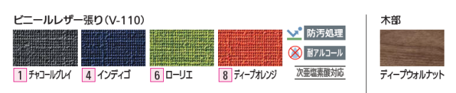 脚: ブラック(BL) シルバーメタリック(SM) 張地(ビニールレザー張り): 1 チャコールグレイ 4 インディゴ 6 ローリエ 8 ディプオレンジ 木部:ディープウォルナット |