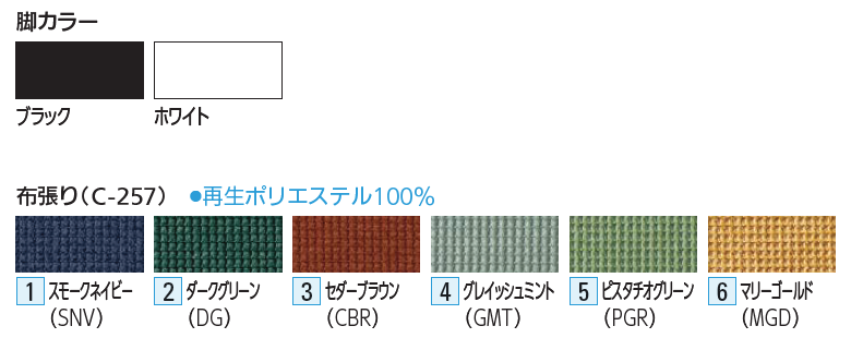 脚カラー: ・ブラック ・ホワイト 布張り: ・1 スモークネイビー ・2 ダークグリーン ・3 セダーブラウン ・4 グレイッシュミント ・5 ピスタチオグリーン ・6 マリーゴールド |