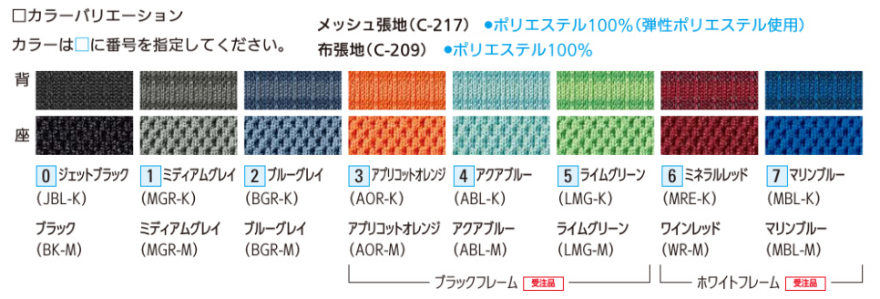 ■フレーム/脚: ホワイトフレーム/ブラックフレーム ポリッシュ脚 ■布張地(背/座) 0 ジェットブラック/ブラック 1 ミディアムグレイ/ミディアムグレイ 2 ブルーグレイ/ブルーグレイ 3 アプリコットオレンジ/アプリコットオレンジ ※ブラックフレームは受注品 4 アクアブルー/アクアブルー ※ブラックフレームは受注品 5 ライムグリーン/ライムグリーン ※ブラックフレームは受注品 6 ミネラルレッド/ワインレッド ※ホワイトフレーは受注品 7 マリンブルー/マリンブルー ※ホワイトフレームは受注品 |