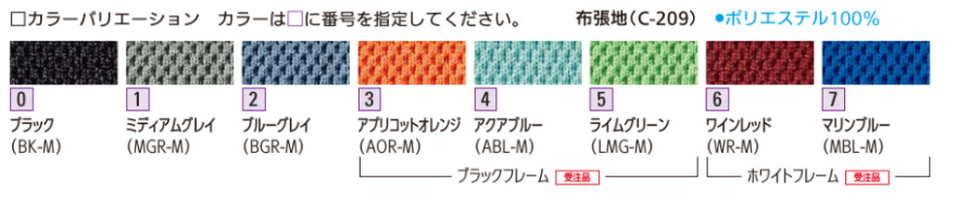 ■フレーム/脚: ホワイトフレーム/ブラックフレーム ポリッシュ脚 ■布張地 0 ジェットブラック 1 ミディアムグレイ 2 ブルーグレイ 3 アプリコットオレンジ ※ブラックフレームは受注品 4 アクアブルー ※ブラックフレームは受注品 5 ライムグリーン ※ブラックフレームは受注品 6 ワインレッド ※ホワイトフレーム/ブラックフレームは受注品 7 マリンブルー ※ホワイトフレーム/ブラックフレームは受注品 |