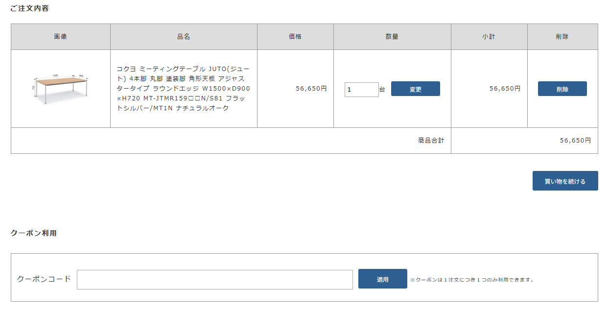 ご注文手続き画面にて、クーポンコードを入力し「適用」をクリックしてください。クーポン適用後のご購入金額が表示されます。対象外商品の場合は、エラーが表示されます。コクヨ・内田洋行の商品を同時に購入される場合は2社の商品合計に応じて、クーポンコード入力してください。